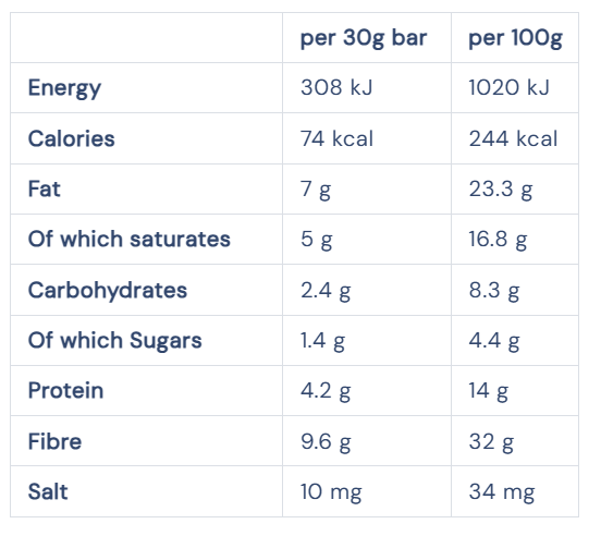 Full Nutritional Information per 30g bar: Energy 308kJ, Calories 74 kcal, Fat 7g (of which Saturates 5g), Carbohydrates 2.4g (of which Sugars 1.4g), Protein 4.2g, Fibre 9.6g, Salt 10mg